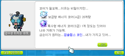 보금형 에너지 코어 (A급) 20개와 특수형 에너지 코어 (S급) 한개를 통해 앱솔랩스 코인 한개를 얻을수있습니다.