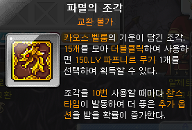 카오스 벨룸을 잡으면 파멸의 조각이 랜덤개수만큼 떨어집니다 이 조각을 15개를 모아 뽑으면 파프니르 무기를 선택하면 하나 얻으실수있습니다!(추옵은 랜덤)