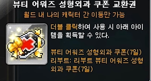 지난번에 했던 성형이 마음에 들지 않는다면 이 쿠폰을 이용해 뽑아보시거나! 부캐 캐릭 성형에 도움이 될 것 같습니다.
